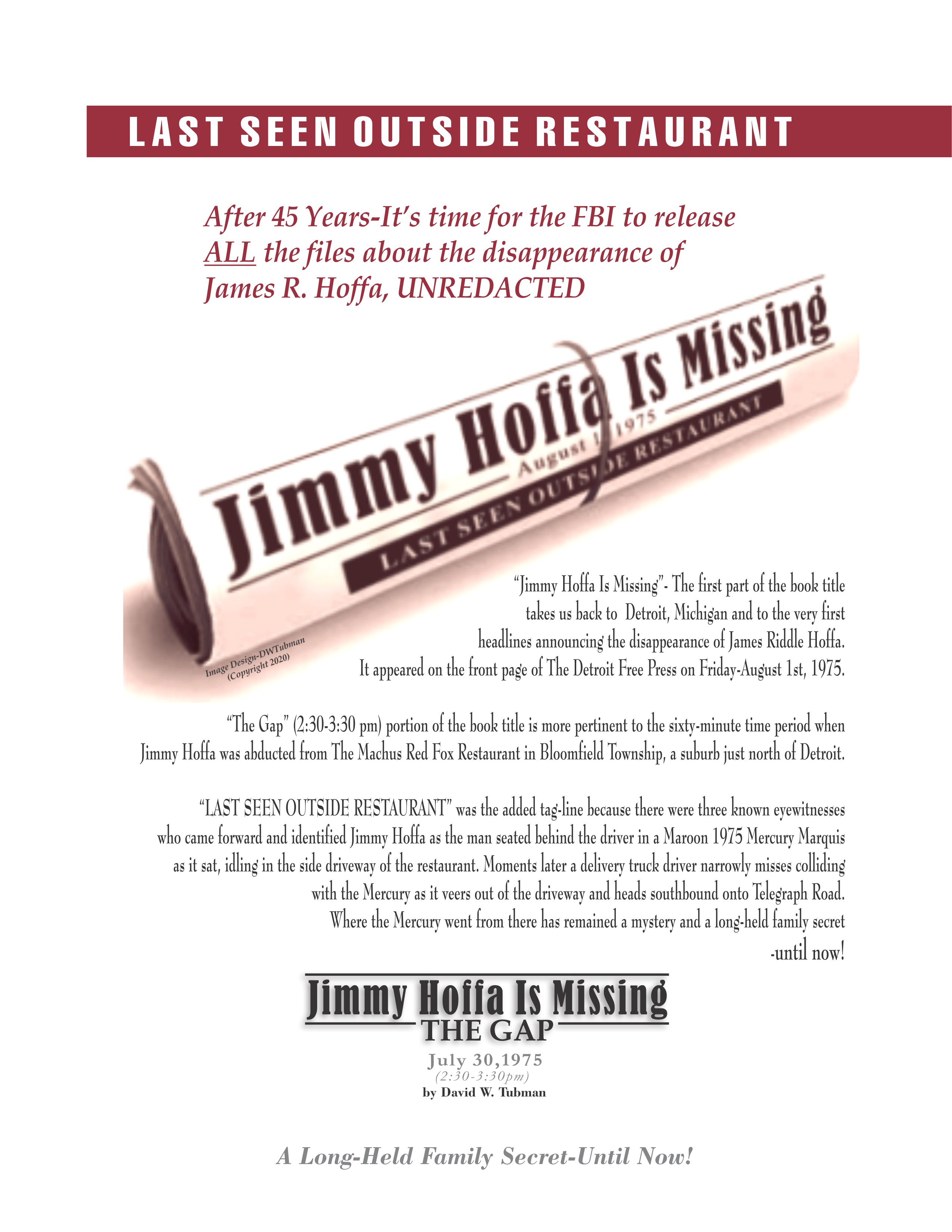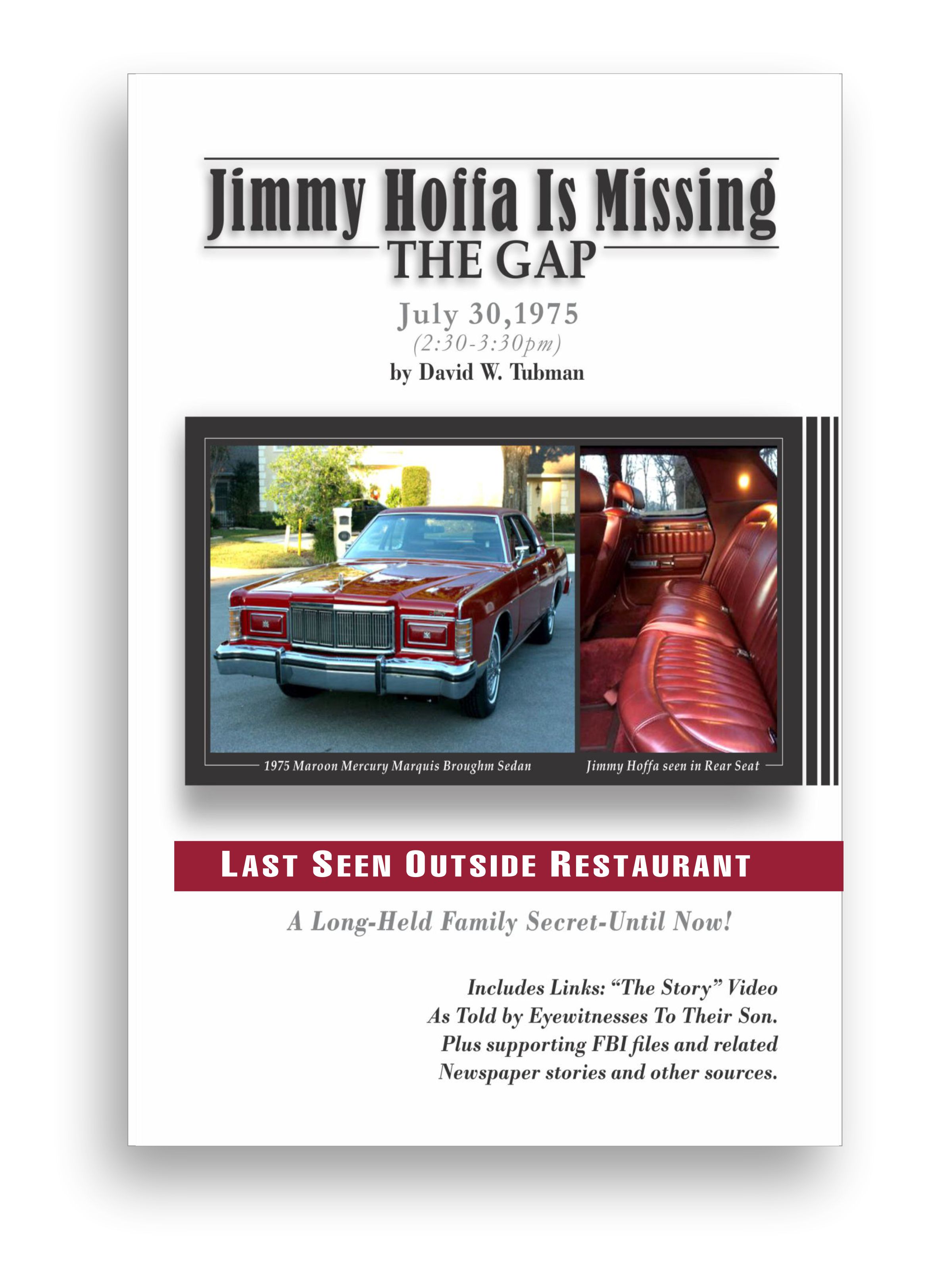 The author is the son of two eyewitnesses to the abduction of James Riddle Hoffa as the car he was riding in left the Machus Red Fox Restaurant. They identify the car, the driver, where it went to next, and what was waiting for it when it arrived. David W. Tubman is now uncovering his own ‘Family Secret,’ by releasing to the general public news and information that has never before been revealed-except to the FBI and the families of those intimately involved in the James Riddle Hoffa case of July 30, 1975 (45 Years ago on the 30th of this month).