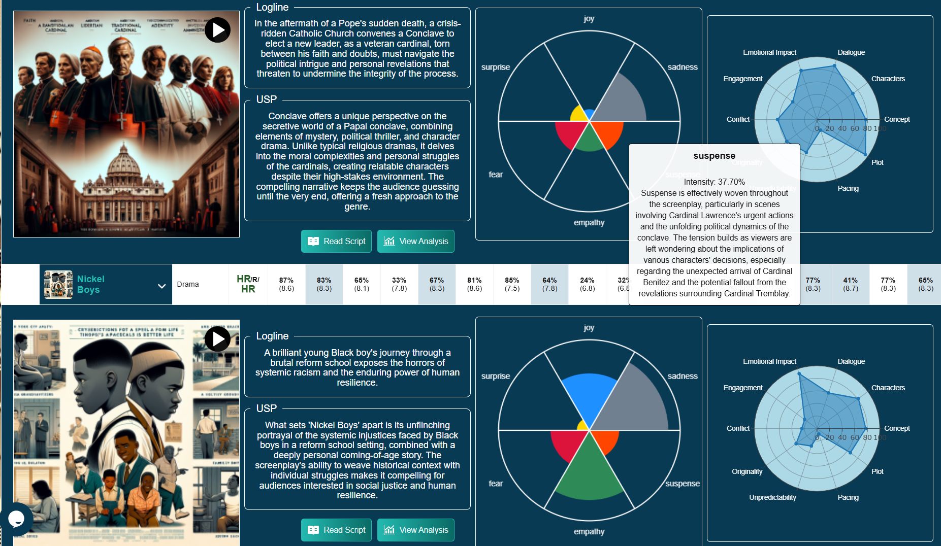 Screenshots on the Oscars page visually highlight these findings—featuring graphs of various skills, emotional arcs, and each script’s unique selling points. While the race isn’t over, these early insights suggest that strong character scores may be a critical “Oscar factor” to watch.
