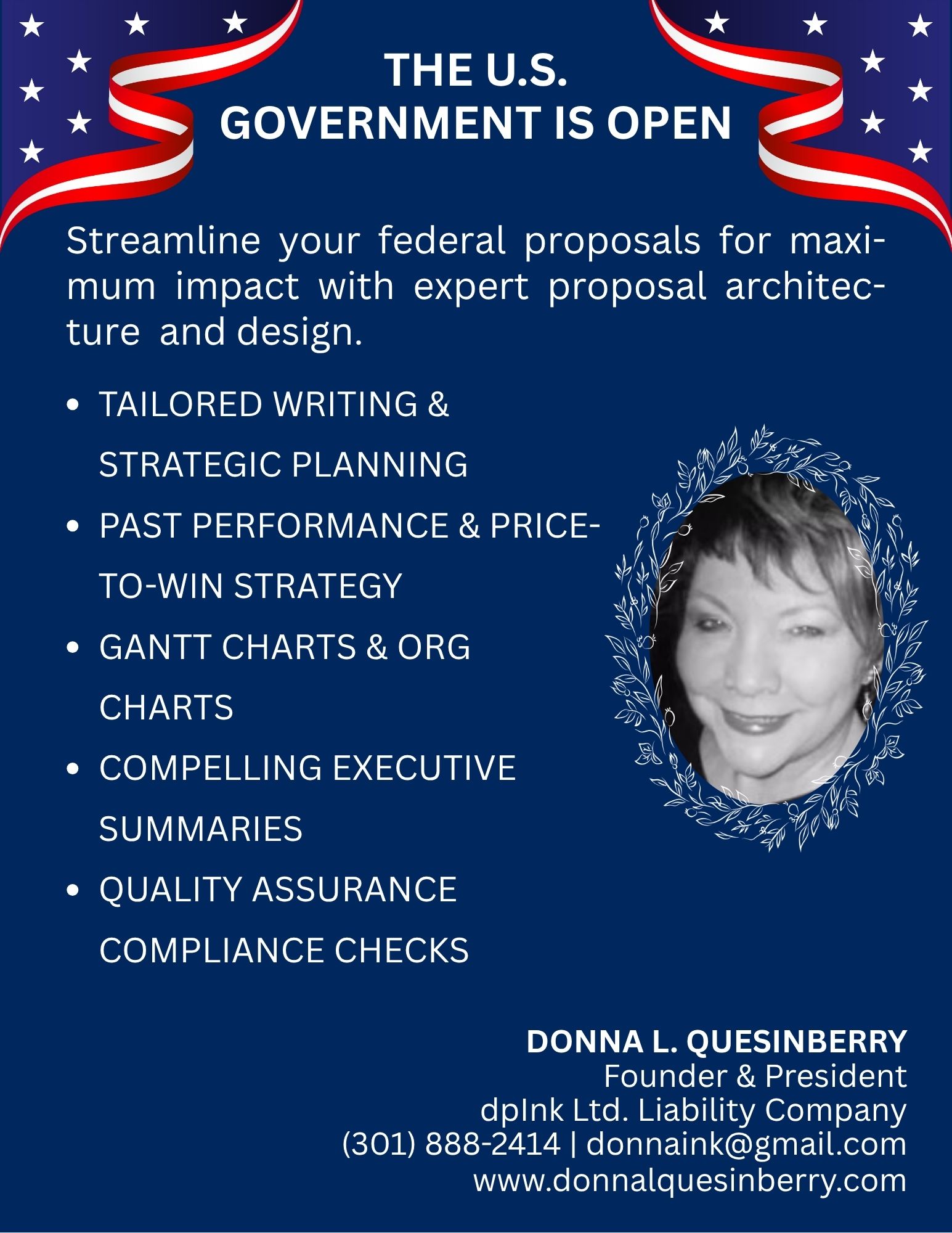 About Donna L. Quesinberry - Donna is a multidisciplinary strategist, publisher, and federal contracting expert with over 25 years of experience driving mission‑critical initiatives across defense, energy, healthcare, intelligence, IT, and public service. She serves as Founder & CEO of dpInk Ltd. Liability Company, President of DonnaInk Publications, COO of Faces of Rap Mothers Enterprise, and Executive Producer & Host of The DonnaInk Channel & Book Show.