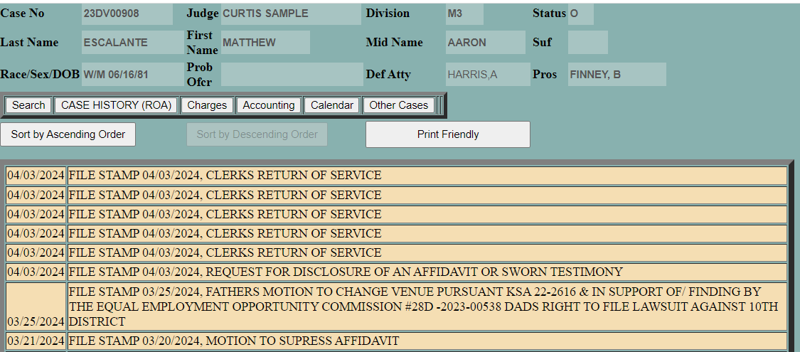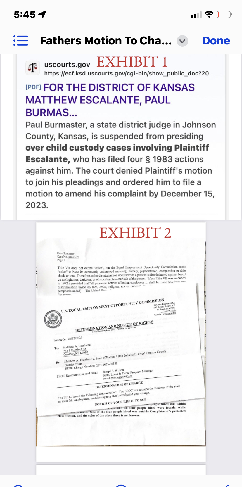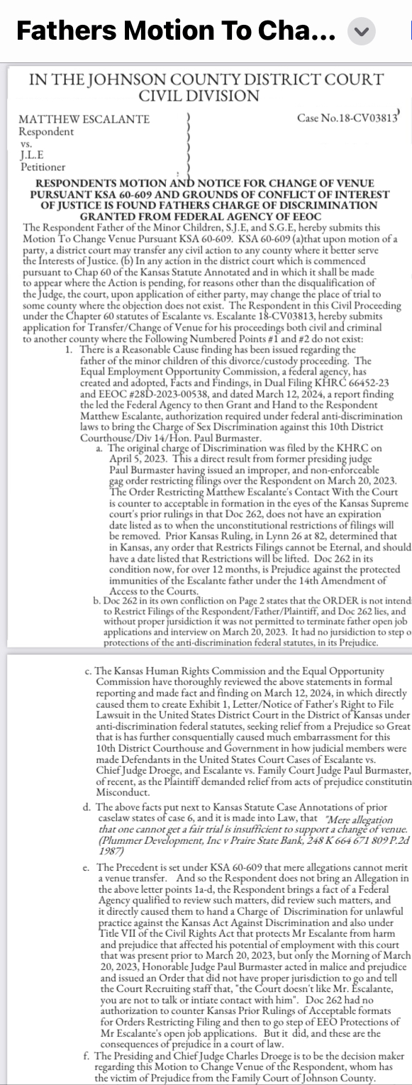 That above claim is the mantra in all of the dads cases. And further scandalous when it's seen what Chief Judge is doing in another whistleblowers docket. Father M.E, shows a Motion to Change Venue in 18CV03813, pursuant statute was declined docketing on Friday April 5th 2023, and the grounds for venue change are affirmative in that case. The pro se father holds a discrimination charge and letter to sue the JoCo Court in the case record attached to the motion. This is the same respondent pro se father who just pushed three lawsuit onto Burmaster, over the last 6 months of Escalante vs Burmaster I, II and III, in which the defendant Judge oddly escaped. And now the EEOC has come in and said, sue the Judge Burmaster again in a Burmaster IV lawsuit!