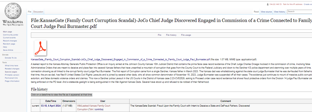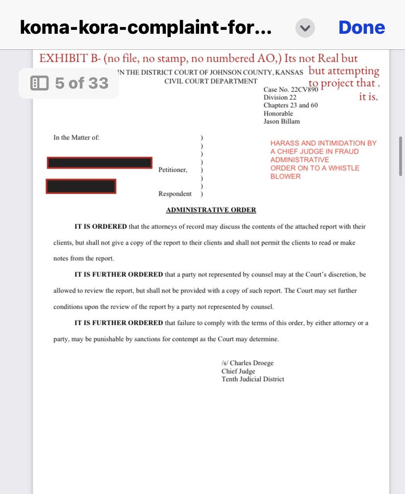 According to emerging evidence on WikiLeaks and WikiAlpha, on Friday, The Chief Judge, knowingly issued that False Administrative order and that it was not just misconduct. The report details that is was a criminal statute violation of KSA 21-5907, simulating legal process to no effect, by attempting to suppress the respondent father from blowing the whistle further on their suspended Judge Burmaster's actions to the KBI. There is an oddity to the fake order in generalities, in that it is attempting to not let the children's own parents have a printed copy of their own kids interactions with the other parent. Droege shows having removed Burmaster on November 16, 2023.