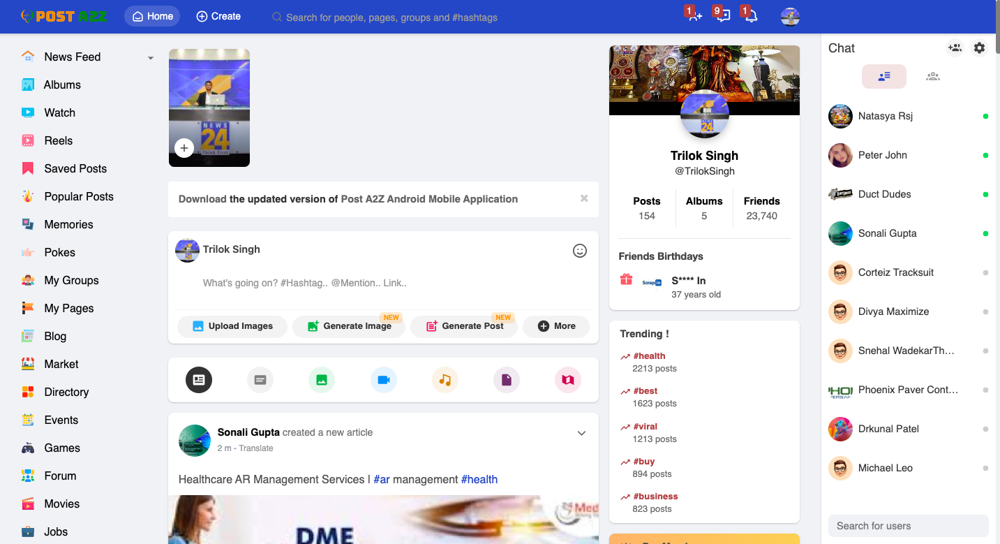 Post A2Z Web: Connect with friends and family and meet new people on your Post A2Z - Social Networking Platform.