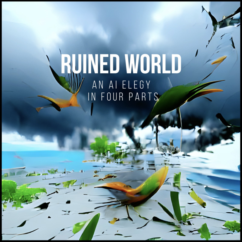 Ruined World an Elegy in Four Parts from Hong Kong - The visuals are a series of AI-generated artworks created by Polyptech (Poposki's creative alter ego in the Metaverse) through text-to-image synthesis utilizing a neural network. The neural network has been trained by Polyptech through thousands of iterations to generate visuals based on a string of keywords associated with climate change, such as the Anthropocene, ecology, nature, etc.