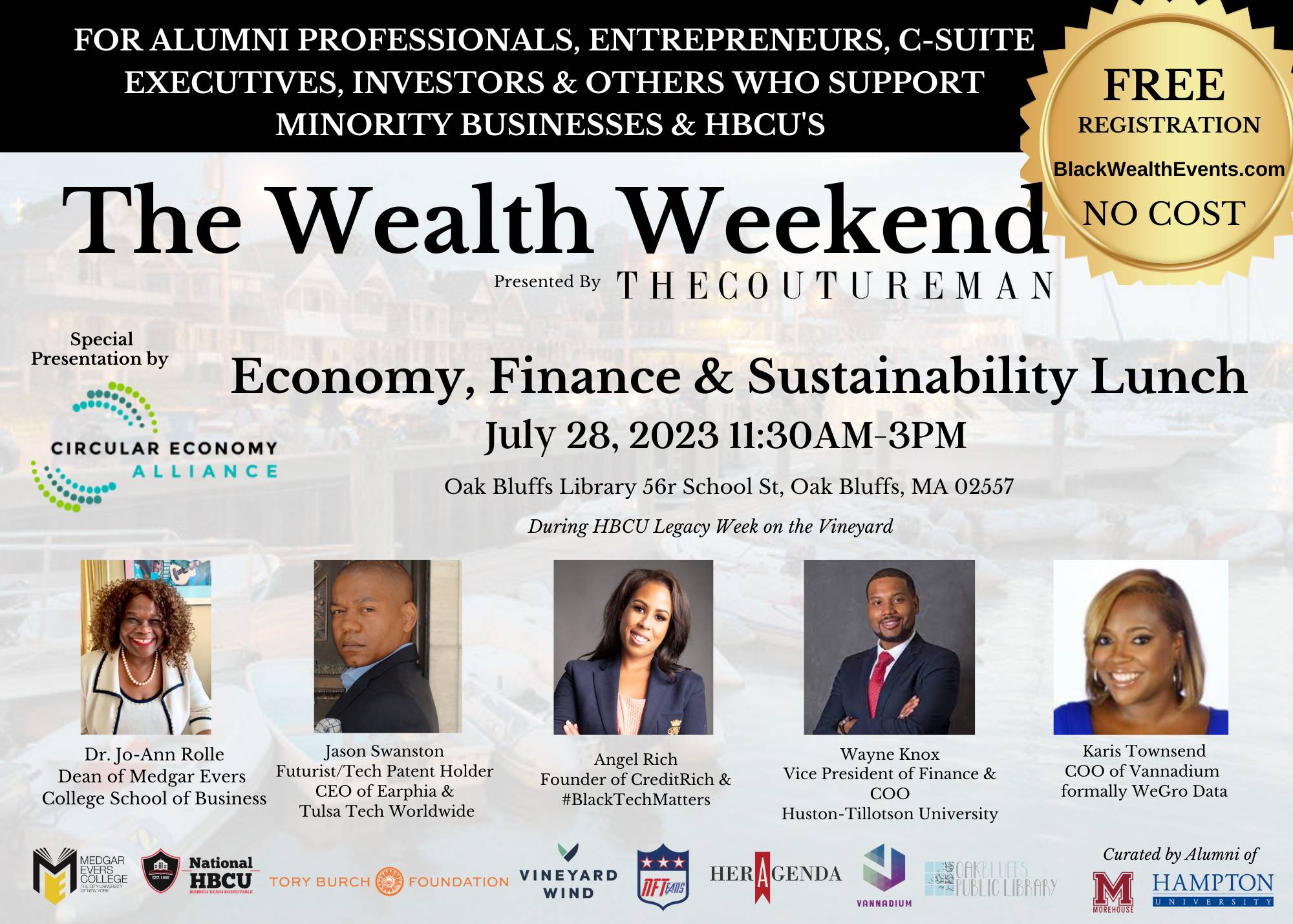 The Wealth Weekend is being supported by The National HBCU Business Deans Roundtable, Medgar Evers College School of Business, Circular Economy Alliance, Tory Burch Foundation, Vineyard Wind, 7Thirty Capital, CreditRich, Tulsa Tech Worldwide, NFT Fans Agency, EARPHIA, Vanadium, New England Sweetwater Farm and Distillery, Winnetu Oceanside Resorts, Faraway Hotels and HerAgenda.
