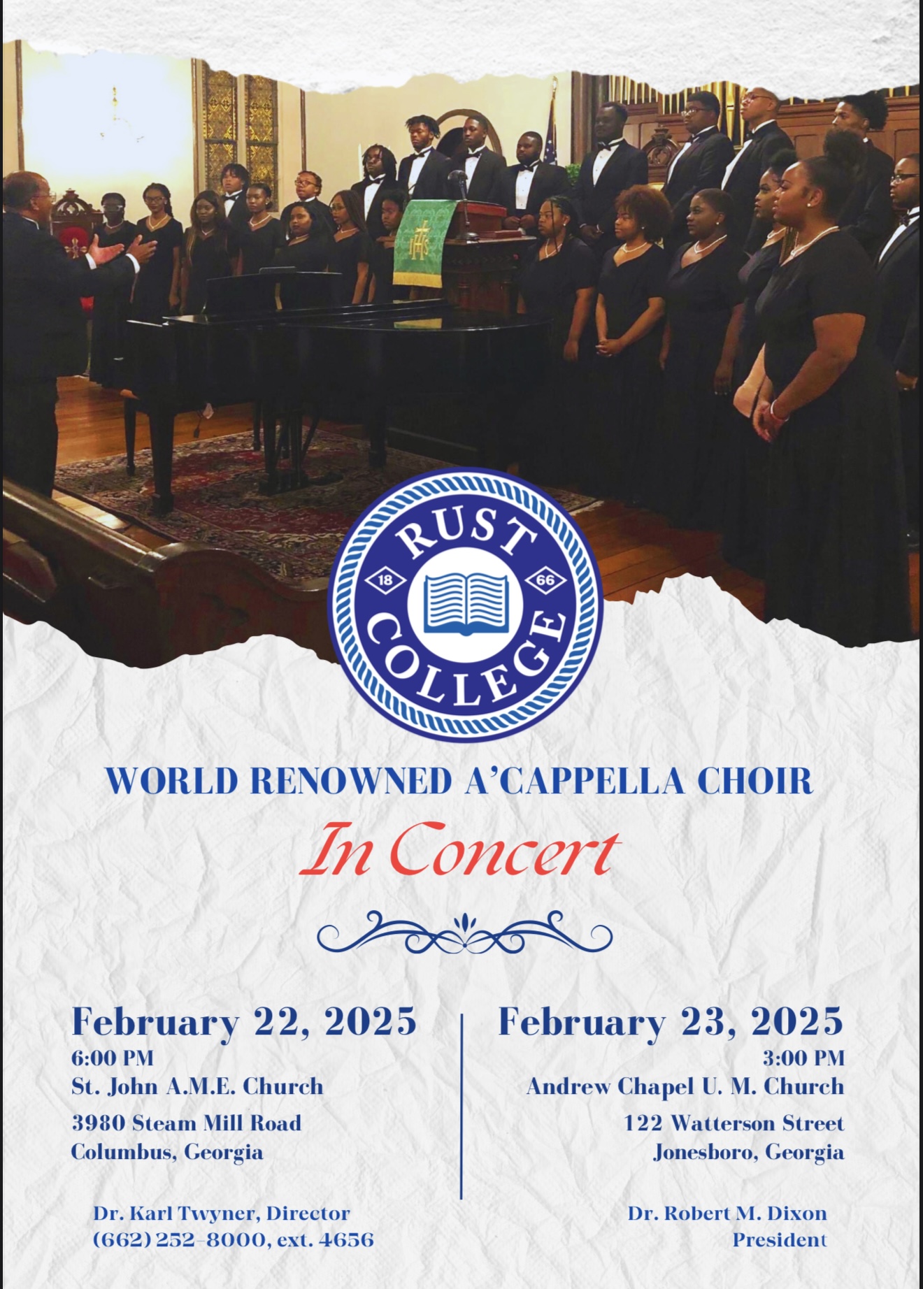 The Rust College A’Cappella Choir, known for its exceptional vocal talent and rich musical heritage, is set to captivate audiences in Georgia with two special performances. The choir will perform at St. John A.M.E. Church in Columbus on February 22, 2025, at 6:00 PM, and at Andrew Chapel U.M. Church in Jonesboro on February 23, 2025, at 3:00 PM.