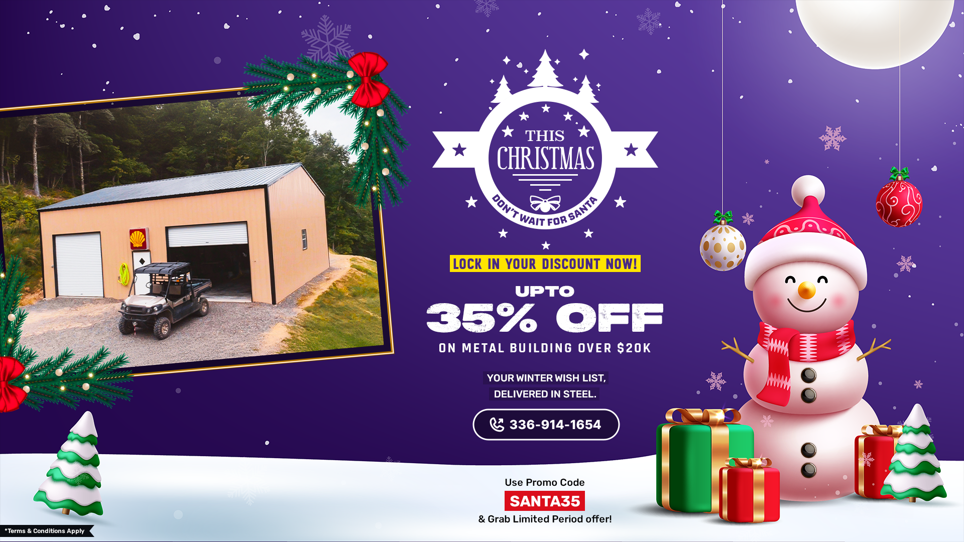 - Call them and share the promo code SANTA35, along with the details of your desired metal building.