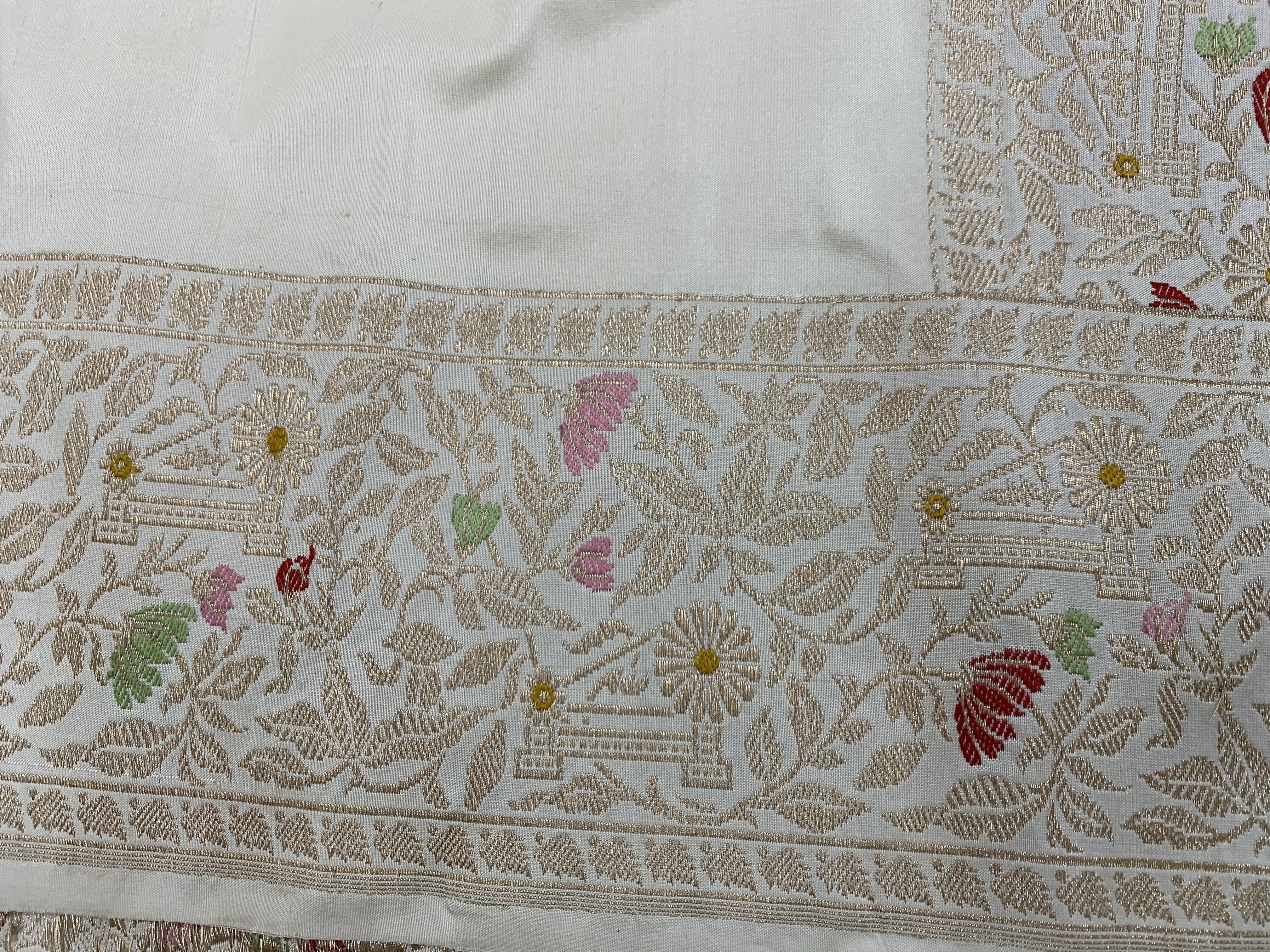 The first colour launched in the Hunar saree is an elegant off-white with a beautiful gold zari border.