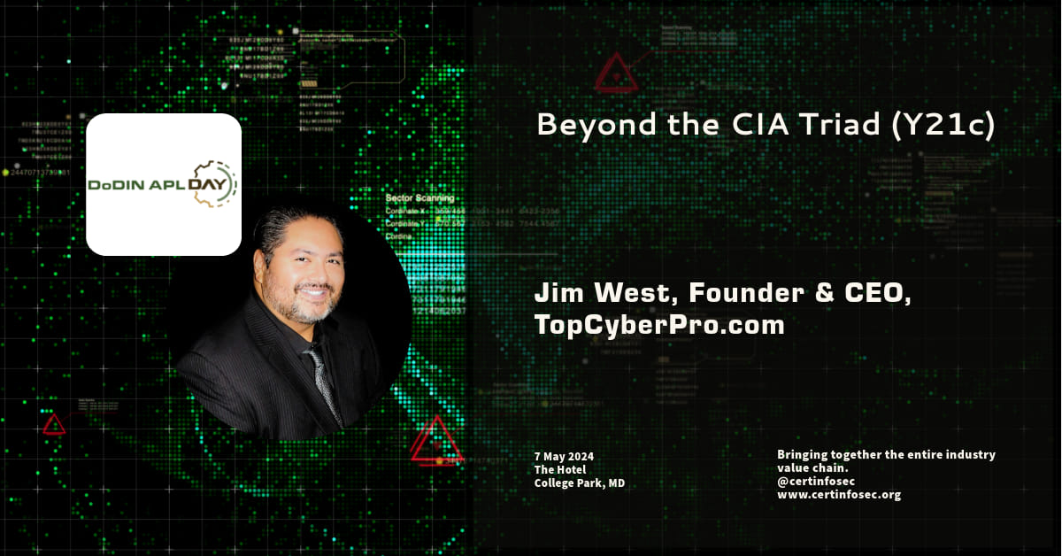 College Park, Maryland May 8, 2024 (Issuewire.com) - Jim West, Cybersecurity Expert, Founder and Chief Executive Officer of TopCyberPro.com, speaks at DODIN APL Day, 2024, on white paper, “Beyond the CIA Triad” highlighting the visual alignment of the nine core security principles and its application to the risk appetite chart. The goal of the talk was to give cybersecurity professionals and leaders this new perspective to help make everyone more effective in their day-to-day duties. This includes vendor/product selections, identifying gaps, and being able to more accurately address the real requirements before acquiring products, solutions, and tools.