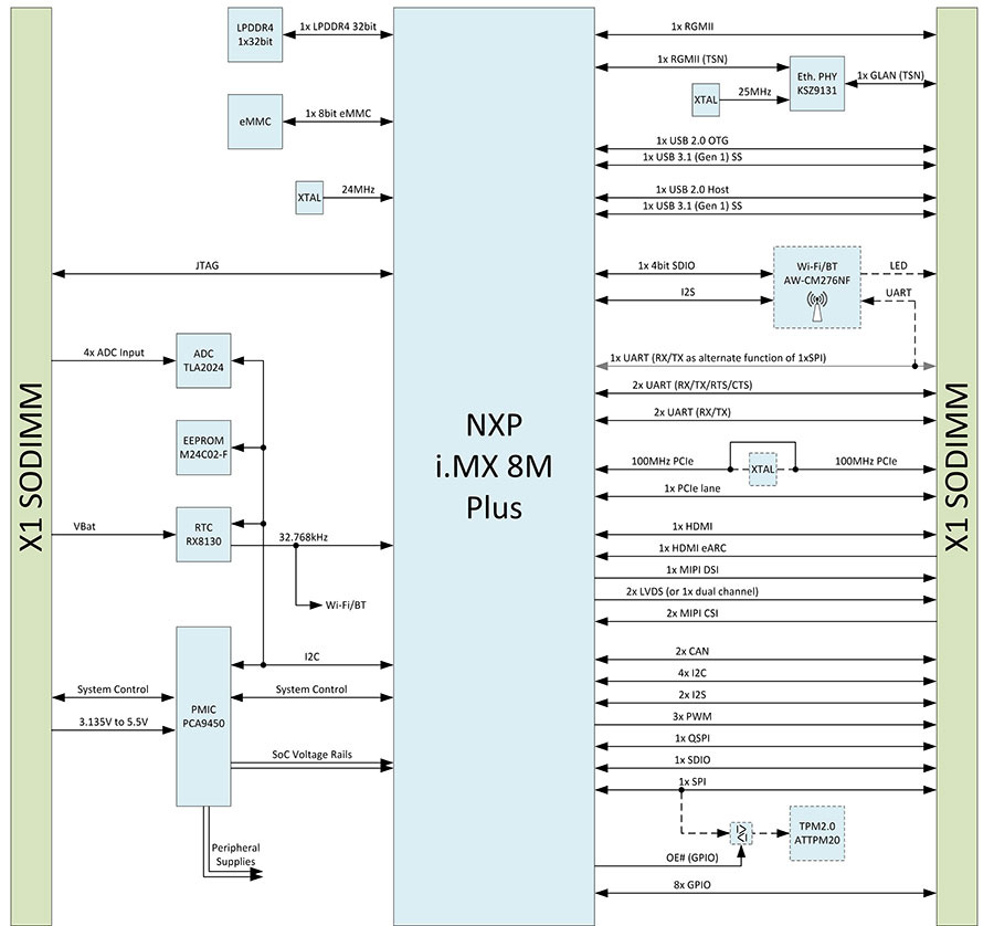 The NXP i.MX 8M Plus features 4x Cortex-A53 @1.8 GHz and a powerful GPU supporting OpenGL ES 3.1, Vulkan, and OpenCL. The integrated Cortex-M7 microcontroller @800Mhz can handle low latency and real-time tasks. Error Correcting Memory (Inline ECC) increases reliability.