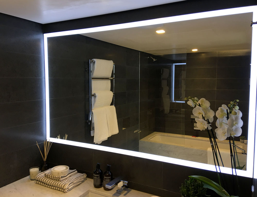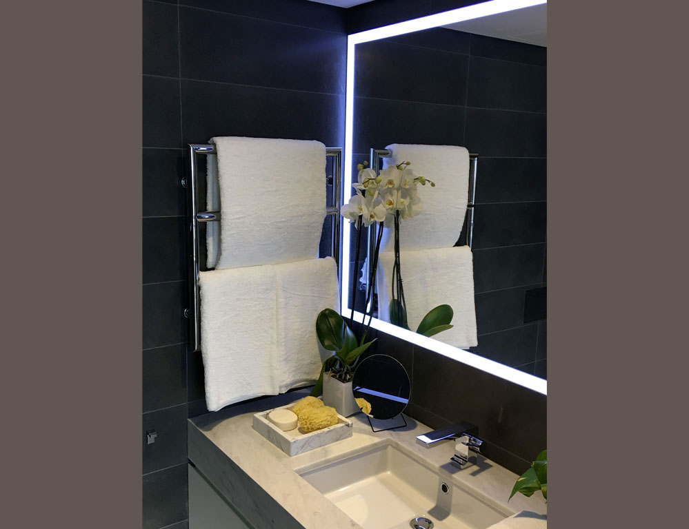 The bespoke LED glass mirrors were designed according to the architect’s exact specification. Each mirror was 20mm in thickness and installed so it is flush with the wall surface. Demister pads were also installed behind every mirror and had to be incorporated into the design plans.