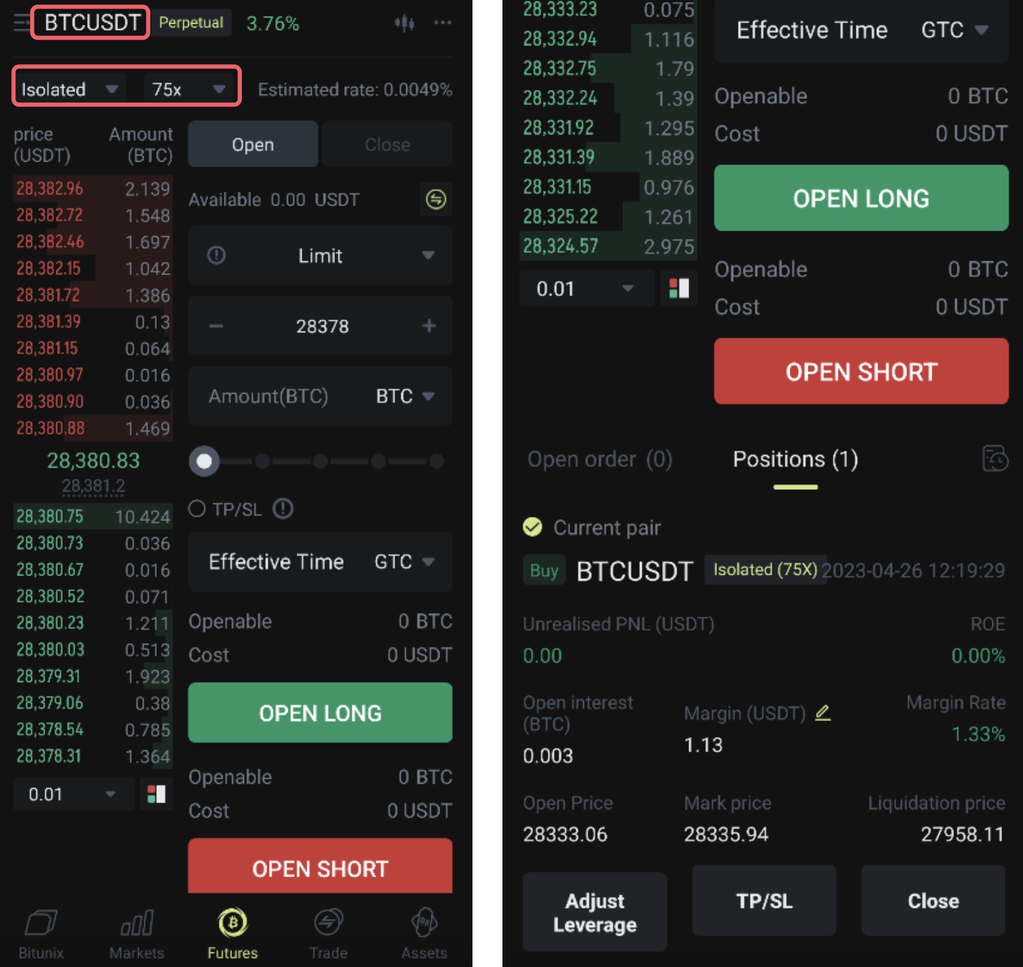 Step 4 - You can select the trading pair, margin mode, and leverage on the top left of the screen. Then, enter the price, and amount before you place your order to open long or open short. Once your order is executed, you will be able to see your current position at the bottom of your screen.