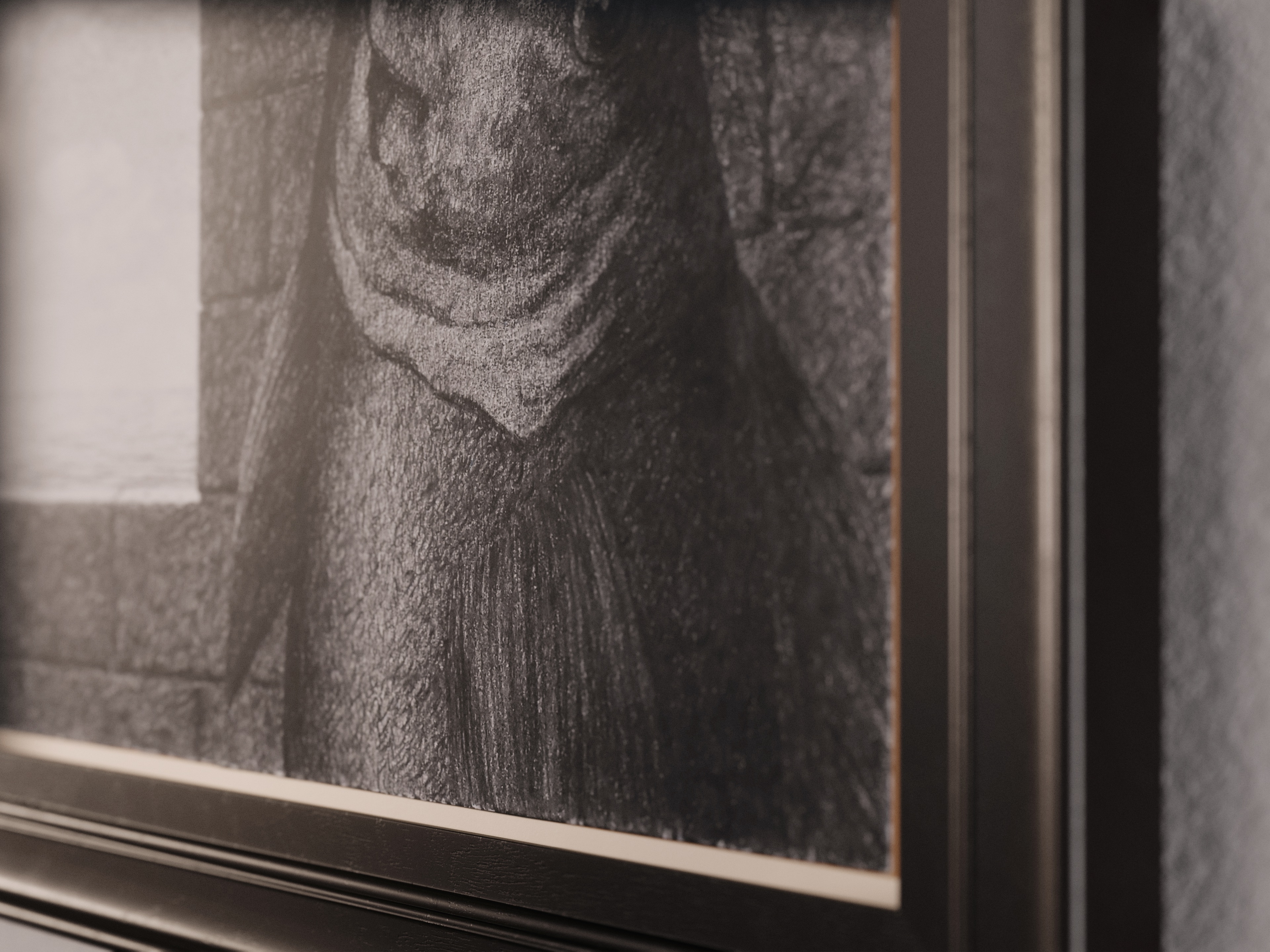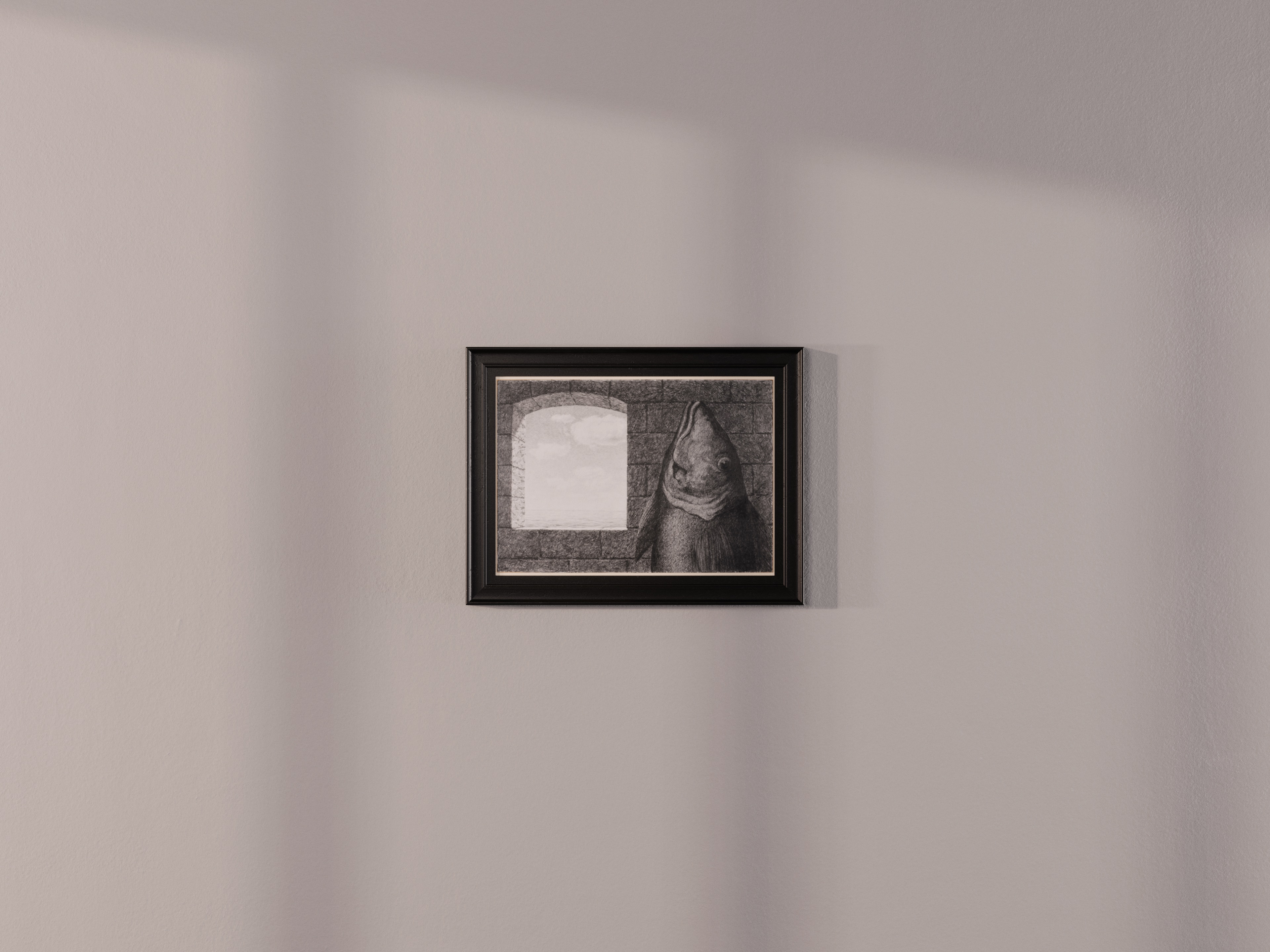 The work, created in pencil on smooth paper, depicts an interior scene with a window opening to the sea. A mysterious ichthyform subject stands in the shadows, typical of Magritte's art of enhancing ordinary objects in a dreamlike manner. The exhibition format "UNTITLED" is not only the title of this work but also the name of the exhibition format that aims to showcase rare and hidden works of art in a re-imagined, immersive experience.