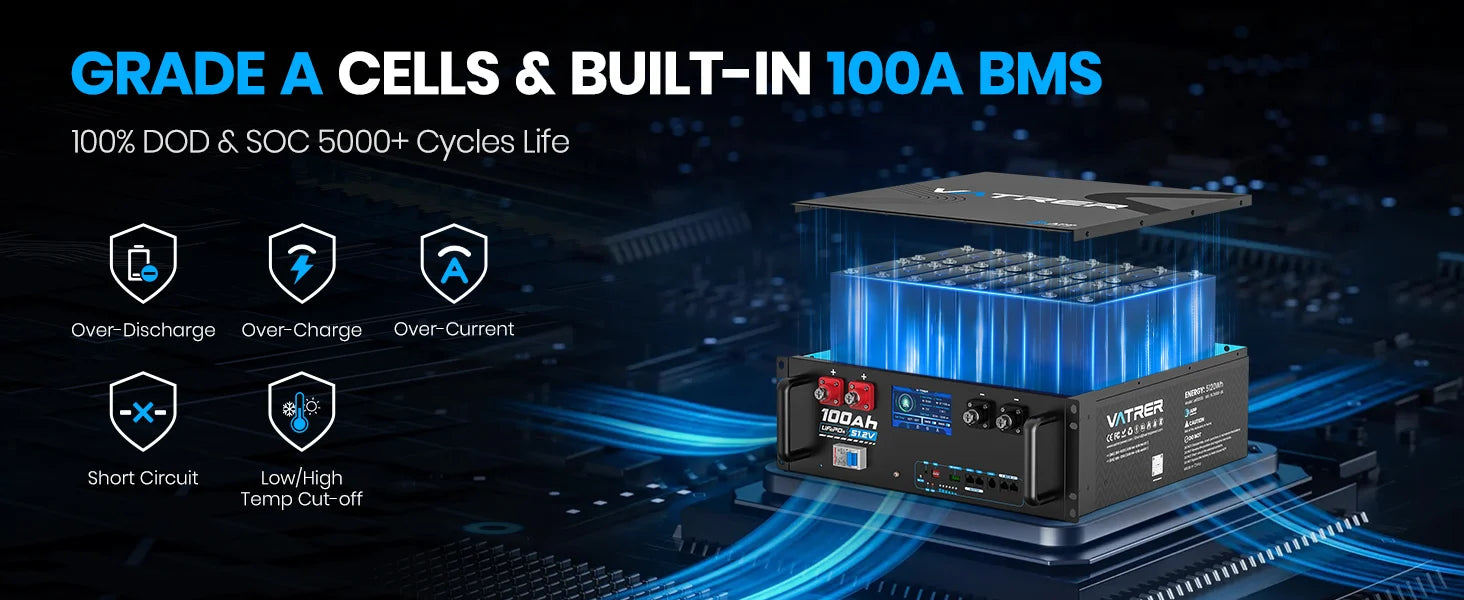 Safety and long-term operational stability remain key considerations in lithium battery design. The Vatrer 48V 100Ah solar battery integrates an advanced Battery Management System (BMS) that continuously monitors the operational condition of the battery pack. The BMS supervises critical parameters including cell voltage, pack current, temperature levels, and overall charge state to ensure safe operation during both charging and discharging cycles.