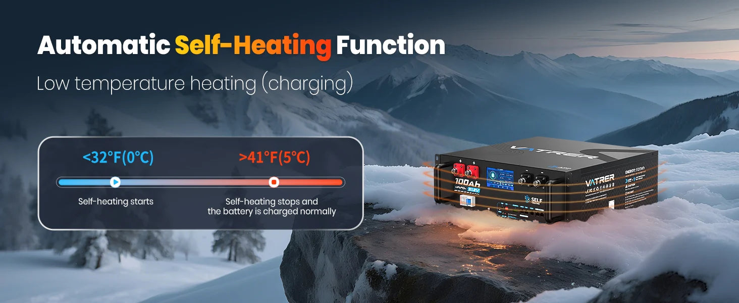 To address this challenge, when ambient temperature drops to approximately 32°F (0°C), this Vatrer 48V 100Ah heated server rack battery temporarily suspends charging and activates its internal heating mechanism. The system gradually warms the battery cells until they reach a 41°F (5°C) temperature.