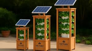 Victory Grow Tower – A vertical hydroponic system with up to 72 grow sites and a solar-powered water circulation pump.