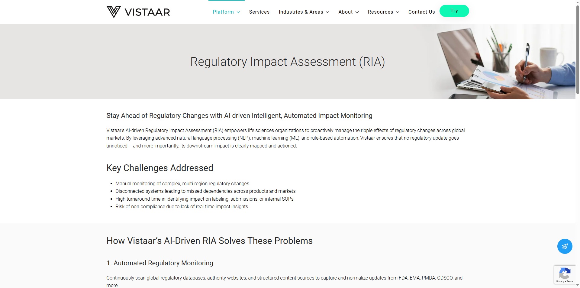 The enhanced RIA solution is now available on Vistaar’s intelligent regulatory platform. By embedding AI-driven analytics, machine learning, and automation into the RIA framework, the solution empowers compliance and regulatory affairs teams to rapidly assess, monitor, and respond to regulatory changes with greater accuracy and speed. Key improvements include intelligent impact mapping, automated identification of regulatory overlaps, and prioritization of compliance actions based on risk level and business relevance.