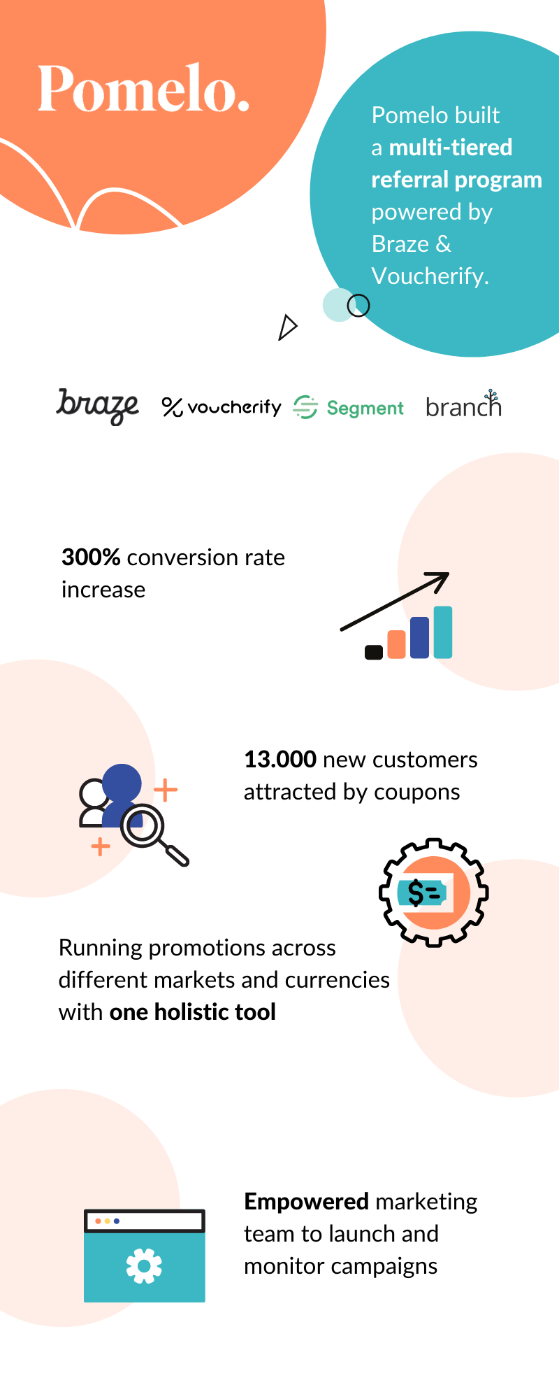 A great example of the power of Voucherify-Braze integration is the case study of their client, Pomelo. Pomelo, an omnichannel fashion platform for greater Asia, created a highly personalized multi-tiered double-sided referral program. The referral flow was based on streaming user data into Segment, creating relevant messages in Braze, utilizing Branch deep links to ensure users land on the app page or app store, and leveraging Voucherify to deliver personalized coupon codes that saw a 300% increase in conversion. Pomelo chose Voucherify because of scalable pricing and native Braze and Segment connectors, which reduced integration time (as they have already been using Braze for omnichannel messaging). Voucherify & Braze tandem became the main promotion engine for Pomelo’s global growth.