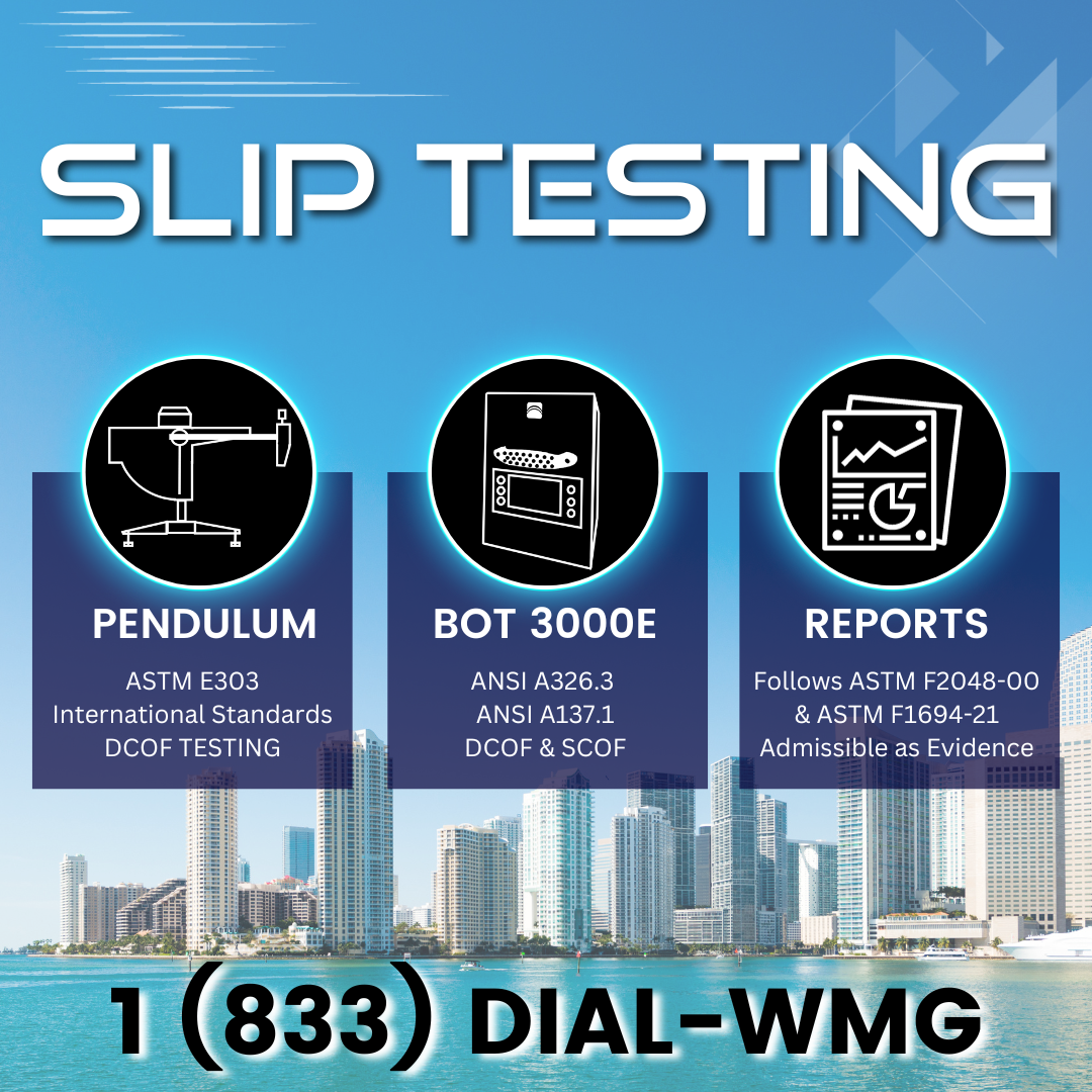 Miami, Florida Sep 16, 2023 (Issuewire.com) - In its continuous effort to set the gold standard in floor safety, Walkway Management South Florida proudly announces the addition of Pendulum Slip Testing in accordance to the ASTM E303-22 standard, to its robust portfolio of floor safety services. As a trailblazer in the industry, the company already utilizes the BOT-3000e, adhering to both ANSI A326.3 and ANSI A137.1 standards.