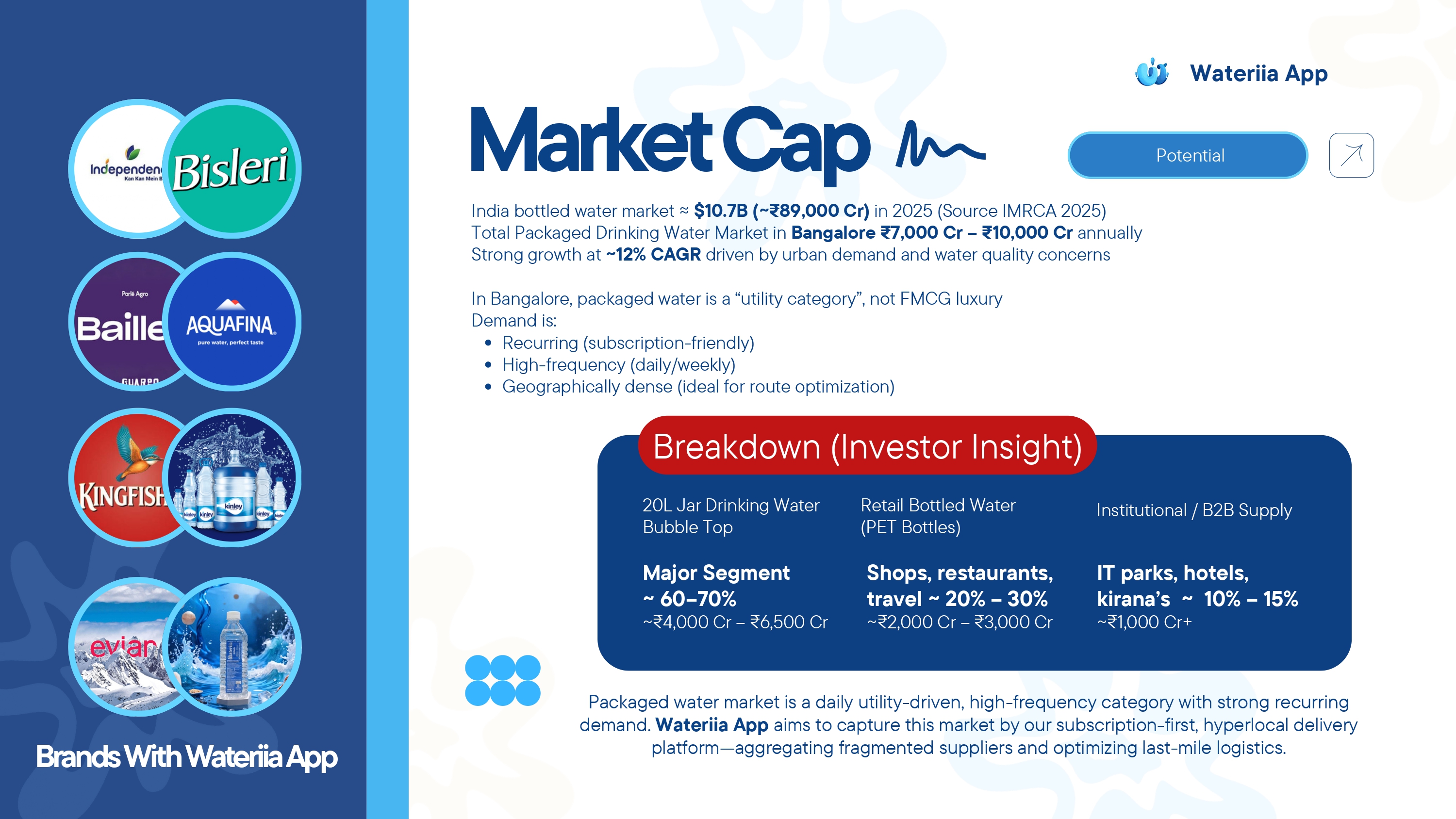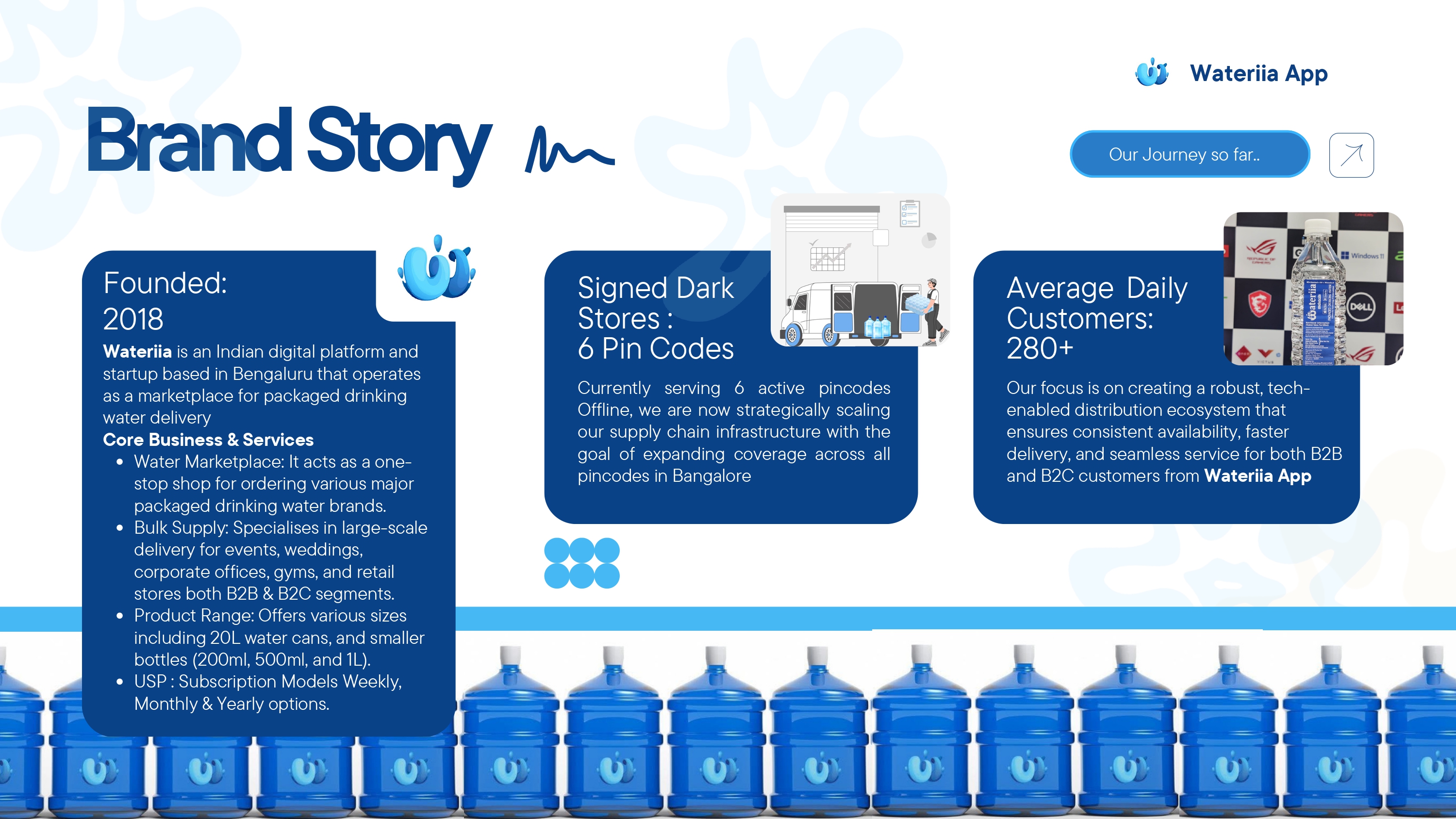 Built under the Wateriia LLP business, the company focuses on high-frequency consumption categories, allowing it to build a strong base of recurring customers through subscription models such as monthly water delivery and essential supply plans.