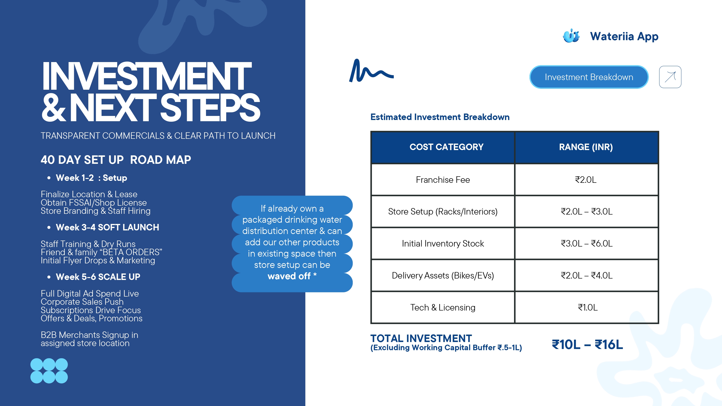 The Wateriia franchise cost is structured to be accessible, making it an attractive business opportunity in the booming quick commerce sector. Franchise partners benefit from: