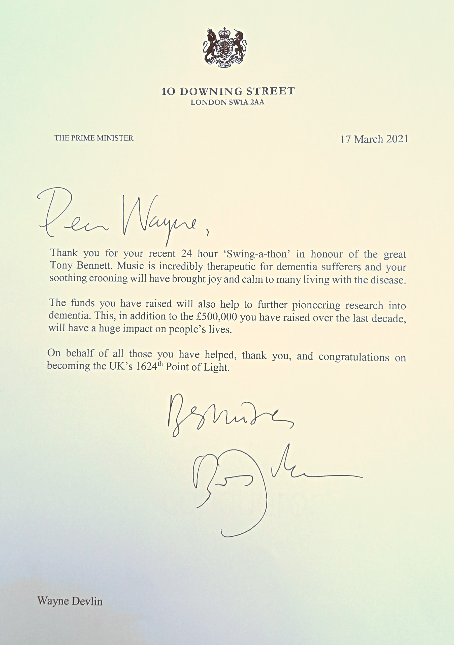 In Manchester, Devlin continues to charm audiences with regular performances at local venues like Mulino, where he celebrated Bennett’s 96th birthday by serenading patrons with a night dedicated to the Great American Songbook. Wayne’s deep connection to these songs, his community, and his craft has earned him not only the respect of his peers but also prestigious honors, including a British Citizen Award for his contributions to the arts and charity, personal invites from the late Queen to Buckingham Palace and the former Prime Minister Boris Johnson to 10 Downing Street and commendations from the Irish Premiere and HRH The Duke of Kent.
