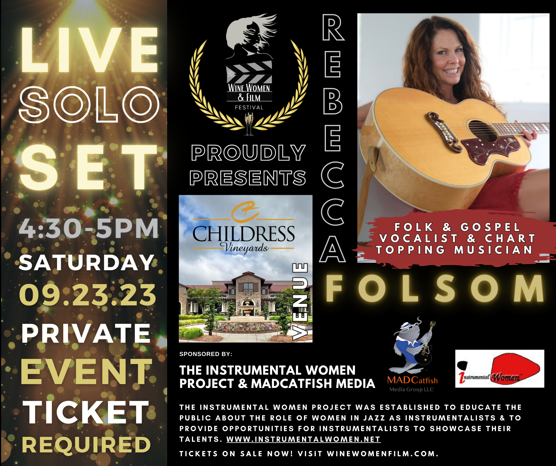 “Rebecca Folsom’s live performance, courtesy of the sponsorship of the Instrumental Women Project and MADCatfish Media, LLC, underscores the importance and value of our mission to showcase supporting women in wine, film and the arts,” Wendy Watts, the festival’s Event Director and Co-Creator stated.