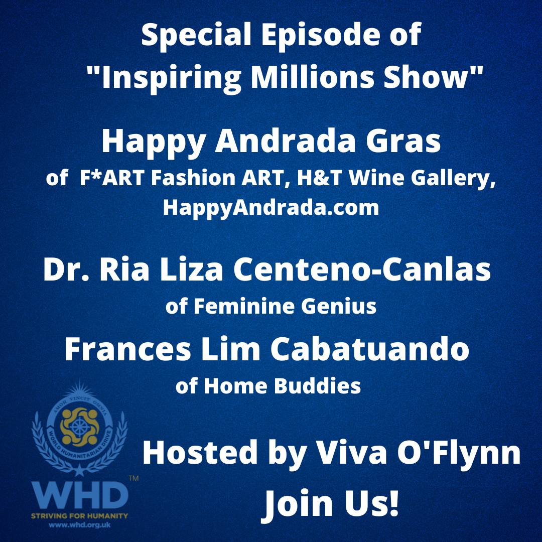 World Humanitarian Drive (also known as WHD) celebrated Philippine Independence Day on its “Inspiring Millions Show” with three inspiring multi-talented, multi-awarded world-class Filipinas: Dr. Ria Liza Centeno-Canlas, the Feminine Genius, Fashion Designer Happy Andrada Gras, and Frances Lim Cabatuando of Home Buddies. The show's host Viva O'Flynn is also an inspiring Filipina.