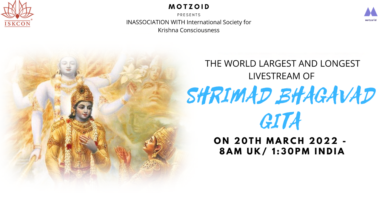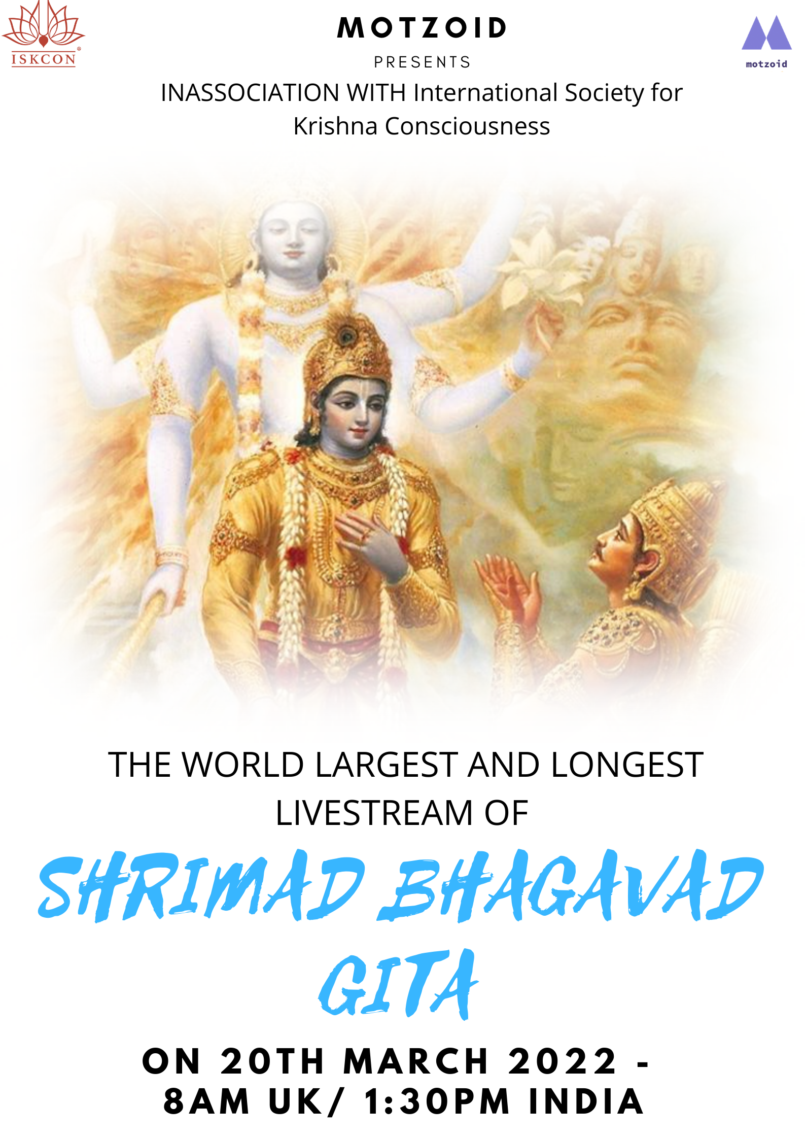 Leicester, England Mar 5, 2022 (Issuewire.com) - The Livestream of Shrimad Bhagavad Gita on Motzoid Bhakti YouTube Channel which is upcoming on 20 March will be the largest and the longest Livestream of Gita. The Livestream will be hosted at 8 am UK time and will be running for over a month.