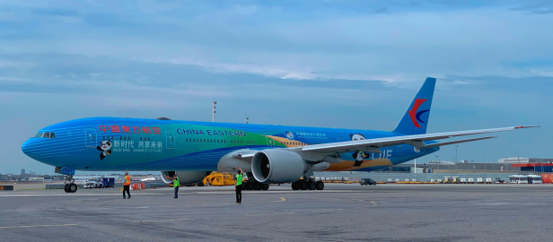 A Boeing 777-300ER jet, which is China Eastern’s international long-haul wide-body flagship aircraft representing the company’s largest passenger capacity, the longest range, and world-leading cabin service system, was chosen as the world’s first CIIE-themed airplane.