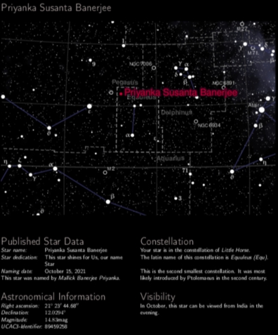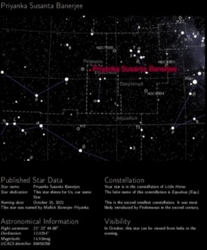 Cambridge, United Kingdom Dec 14, 2021 (Issuewire.com) - The World's First Star Owner Universal Fashion Designer is Priyanka Mallick. INTERNATIONAL STAR DIRECTORY Named a star on the Name of Priyanka Mallick. The Name of the star is Priyanka Susanta Banerjee. The star has a magnitude of 14.83 mags. It is at coordinates 12.0294° (declination) and 21h 23m 44.68s (right ascension). Your star is in the constellation of Equuleus (Little Horse)This star is named Priyanka Susanta BanerjeeNamed on October 15, 2021. It was named by: Priyanka Mallick Banerjee, Dedicated to her husband Prof Dr. Susanta Banerjee.