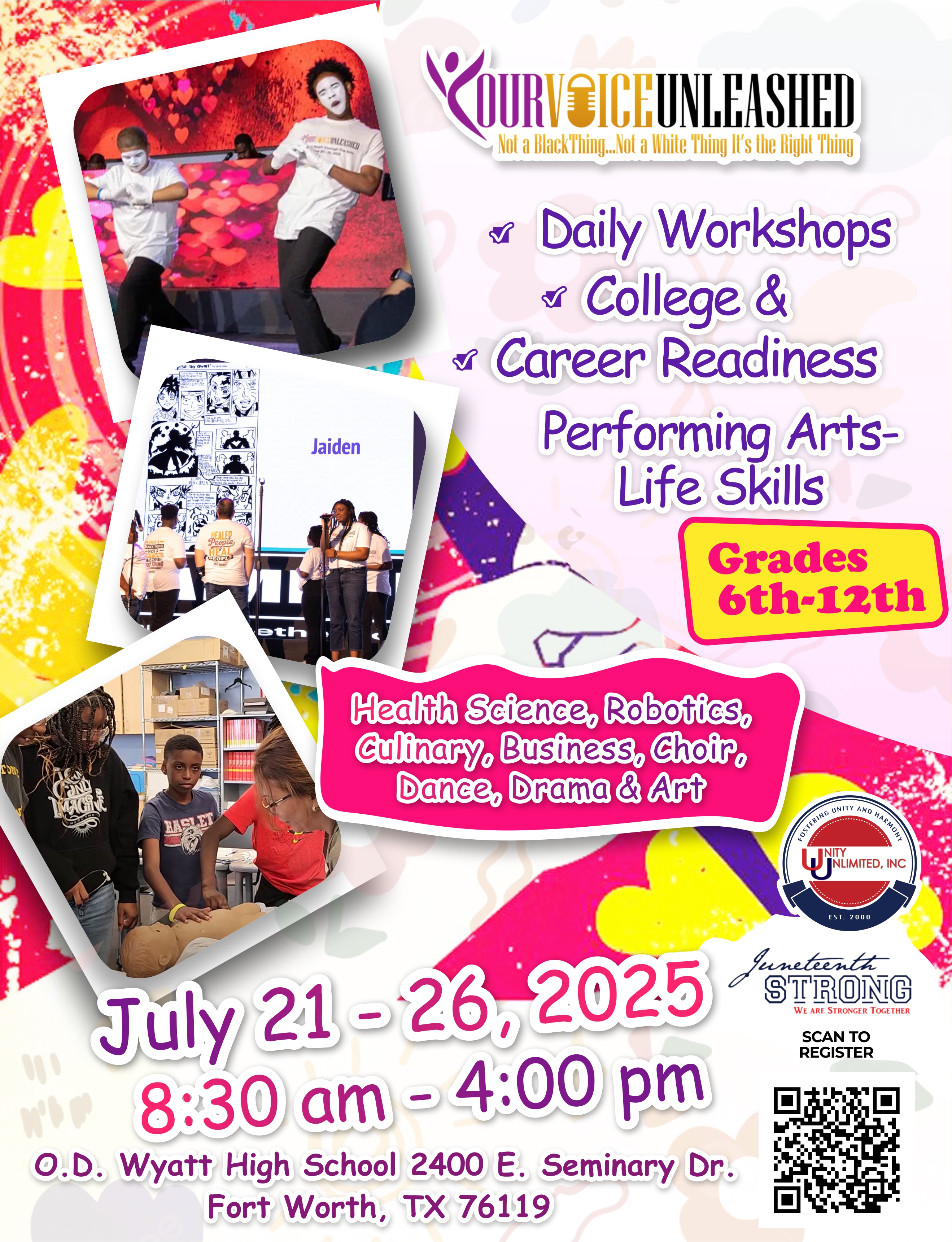 Your Voice Unleashed is an immersive week-long youth empowerment experience designed to inspire and equip students in grades 6–12 through daily workshops focused on college and career readiness, performing arts, and essential life skills. This dynamic program combines education and creativity to help students find and amplify their unique voices.