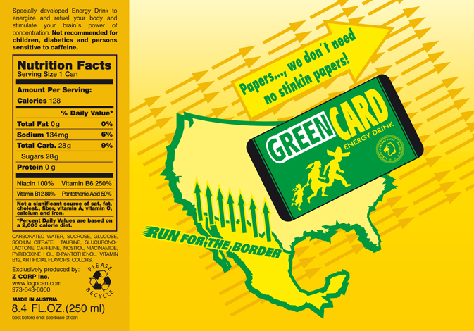 New York City, New York Jun 1, 2022 (Issuewire.com) - Z CORP announced today on this Cinco de Mayo national holiday the official United States launch of Green Card™ Energy Drink to challenge market leader Red Bull. Green Card is an all-natural, long-lasting energy drink that promotes clarity, vigor, and vitality. Green Card is great-tasting and lightly carbonated, this scientific-based formula increases performance, endurance, and concentration, boosts energy, and keeps you up without the crash, so common in energy drinks. Nothing compares to a Green Card if you are looking for an ultra stimulating long-lasting energy drink. No bull. In an independent taste test, consumers preferred Green Card over Red Bull. Green Card Energy Drink was preferred in sweetness, aftertaste, and color. Green Card Energy Drink is set to retail for about half the price of a can of Red Bull, which has proved to be a runaway success in bars and convenience stores.